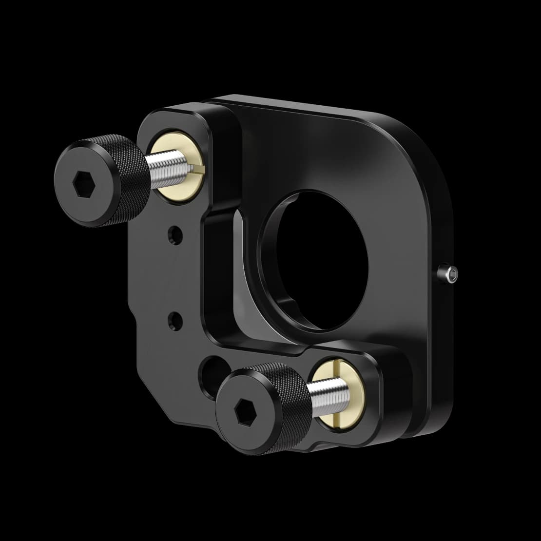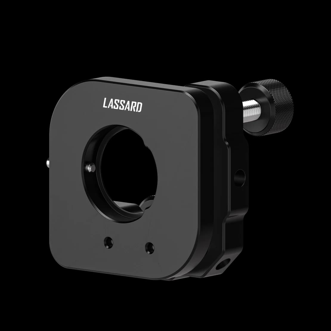 The optical component is mounted in the holder frame on two rigid supports and is securely fixed with a set screw with a plastic tip. It can be mounted on a flat surface or on various brackets and holders using M6 holes. The frame position is adjusted by two precision screws.