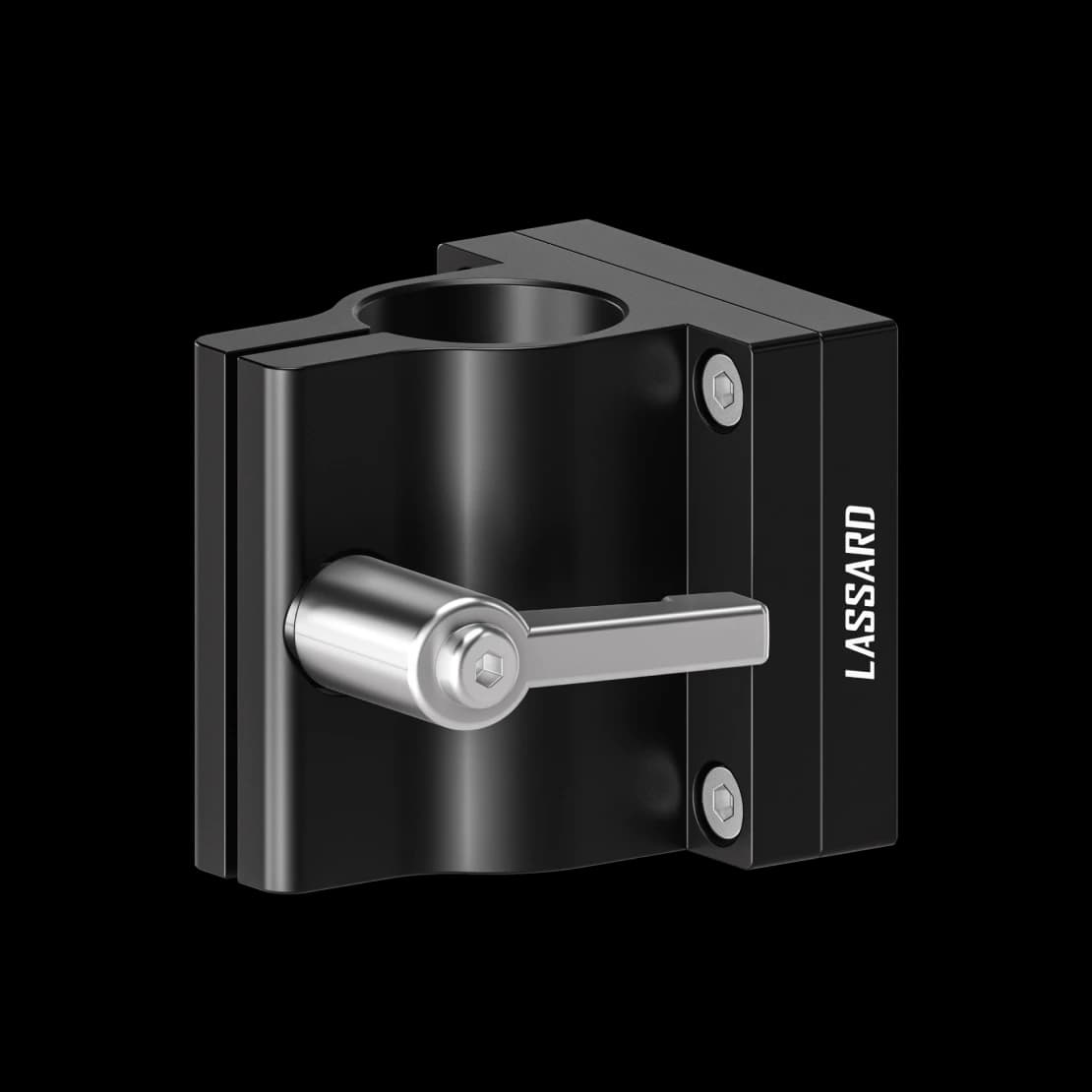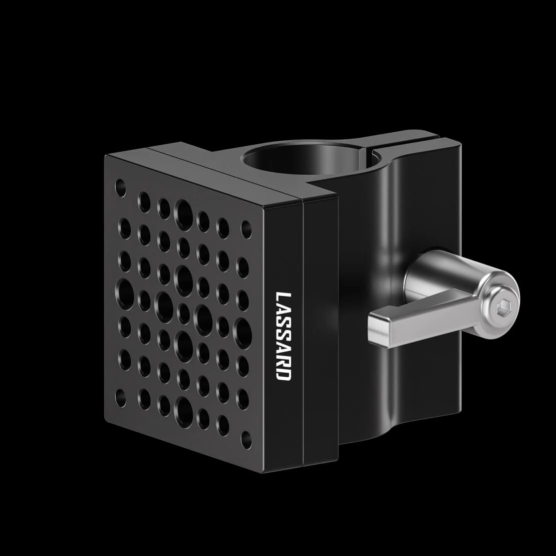 The clamp with handle is designed for fastening parts to a 25 mm diameter rack. The removable plate of 51x51 mm has a grid of M4 and M6 threaded holes.