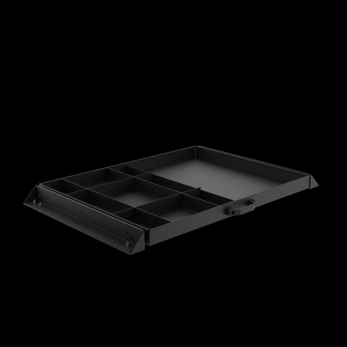 The drawer is made of 2 mm thick powder-coated steel and is mounted on optical table supports with a width of 1, 1.2, and 1.5 m using telescopic fasteners. Ball guides provide full extension, smooth movement, and the ability to remove the drawer. Inside, the drawer is divided by a stationary central partition; the set includes two pairs of dividers and a rubber mat. Color – black.