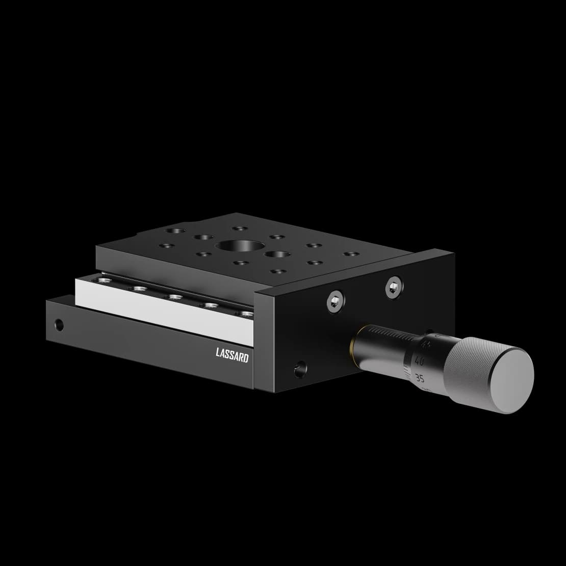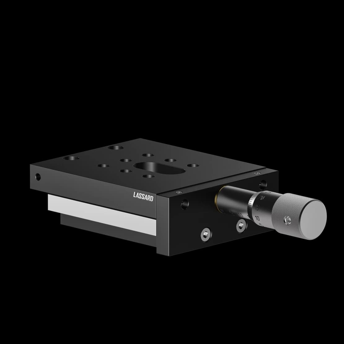 Linear motion translation stage (platform) with a central location of the adjusting screw and a central through hole with a diameter of 12 mm.