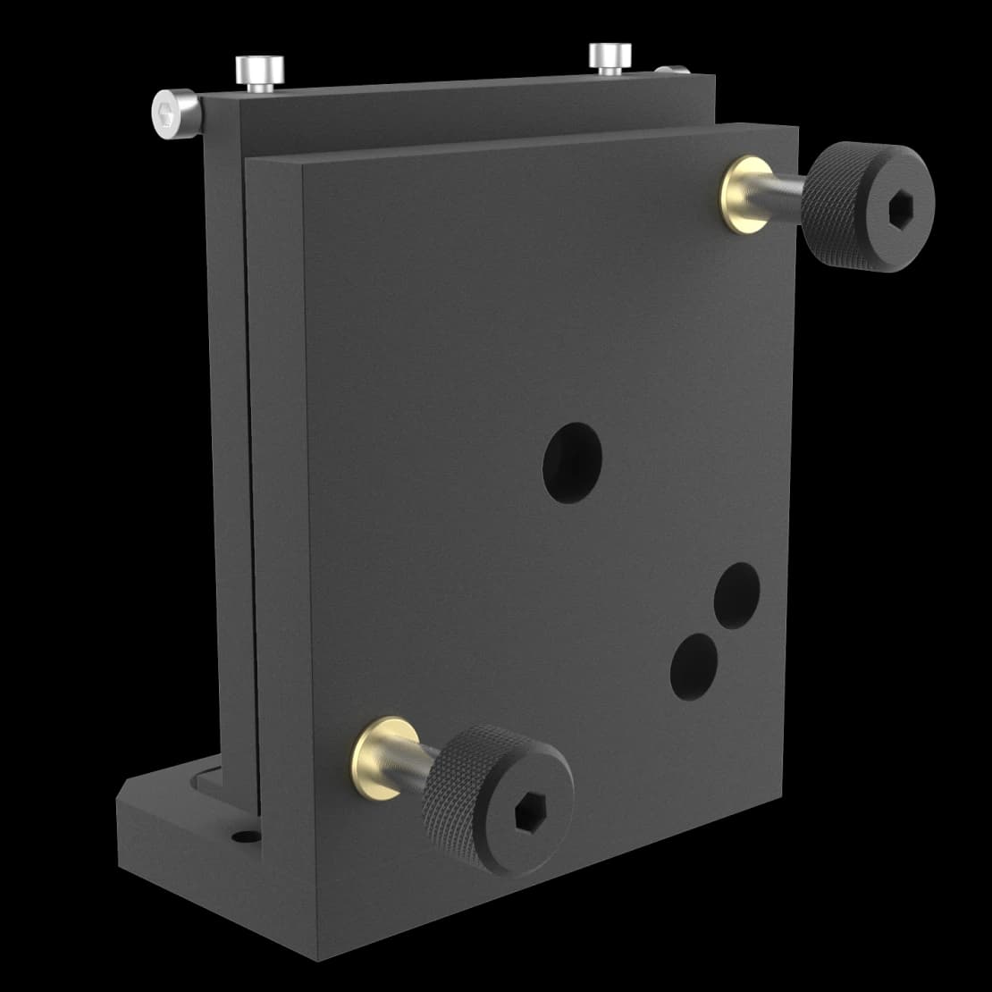 Крепление предназначено для монтажа и юстировки по двум угловым координатам зеркал 75 × 75 мм. Оптический элемент устанавливается на два валика и фиксируется винтами. Крепление устанавливается на поверхность оптических столов, плиты и платформы. В данной модели используются спиральные пружины.