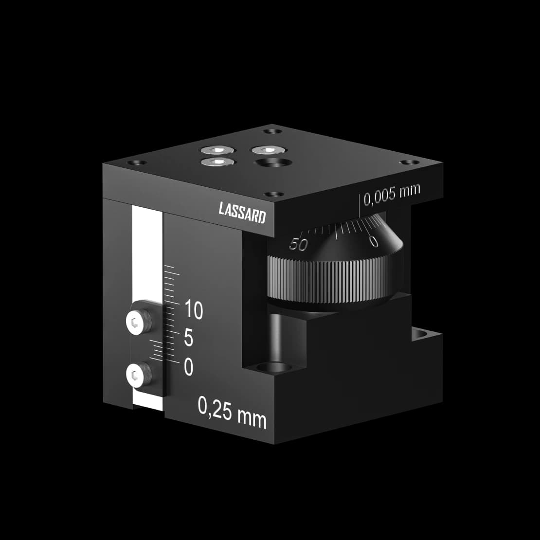 Малая платформа (транслятор) вертикального перемещения обеспечивает плавную регулировку (подъем/опускание): модель 42VTS5 — в диапазоне 5 мм, модель 42VTS13 — в диапазоне 13 мм. На платформе со шкалой Вернье имеется одно центральное резьбовое отверстие М6 и пять (четыре — в варианте 42VTS13) отверстий М3 для соединения с переходными пластинами и кронштейнами.