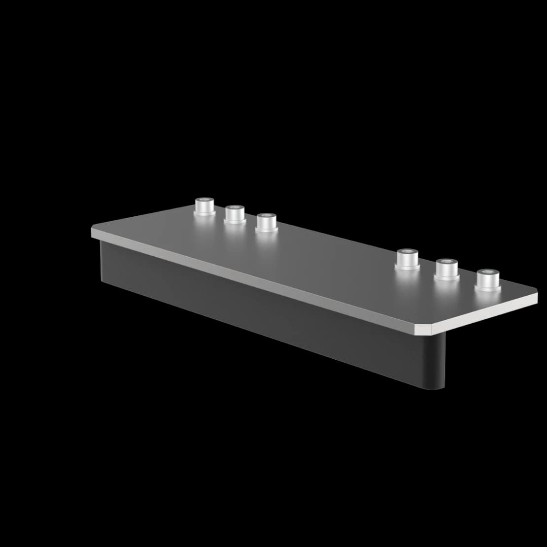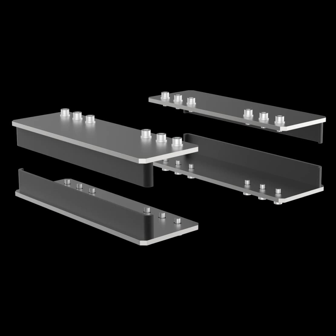 Скобы предназначены для соединения двух сотовых оптических столешниц одинаковой ширины. На верхней поверхности столешниц используются штатные резьбовые отверстия М6. Отверстия на нижней поверхности следует предусмотреть заранее при заказе и изготовлении столешницы. В комплект входят 4 скобы и 24 винта М6 с шайбами.