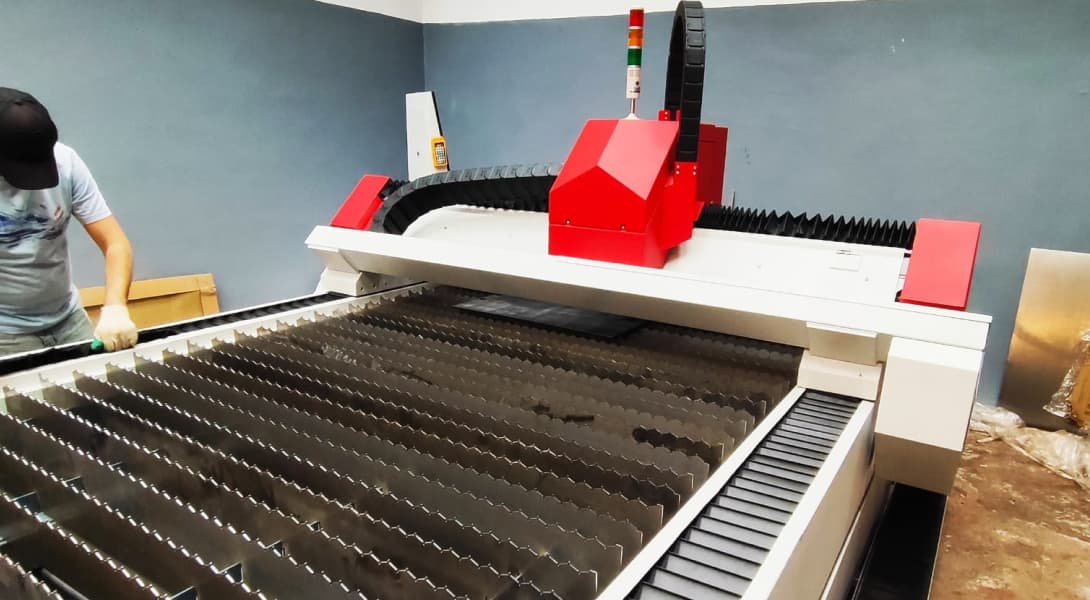 Для решения задач клиента был выбран станок OPTIMUM F с рабочим полем 1500 × 3000 мм. Это значительно упростило работы по сервисному обслуживанию — OPTIMUM F входит в реестр отечественных производителей Минпромторга РФ и собран на 80% из российских комплектующих. На рабочем поле сделали оснастку, в которую можно уложить трубу.
